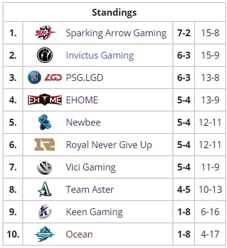 1. Sparking Arrow – ~$31,3132. Invictus Gaming – ~$24,3153. PSG.LGD – ~$20,1454. EHOME – ~$14,5615. Newbee – ~$11,2396. Royal Never Give Up – $9,8257. Vici Gaming – $7,6348. Team Aster – $7,2809. Keen Gaming – $4,94810. Ocean – $3,746