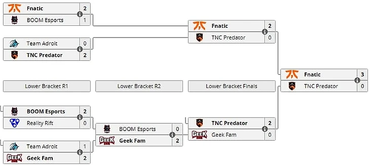 1. Fnatic – $21,0002. TNC – $11,0003. Geek Fam – $6,5004. Boom – $4,5005-6. Reality Rift – $2,2505-6. Team Adroit – $2,2507-8. T1 – $1,2507-8. CR – $1,250