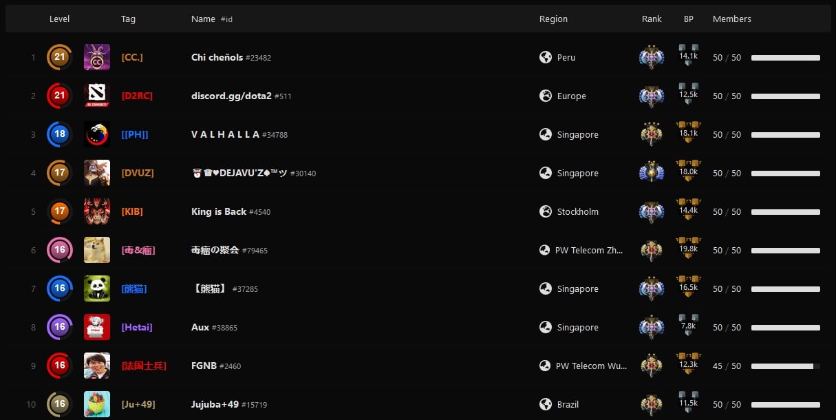В топ-3 гильдий две гильдии 21-го уровня – [CC.] из Перу и [D2RC] из Европы, а также [[PH]] 18-го уровня из Сингапура.