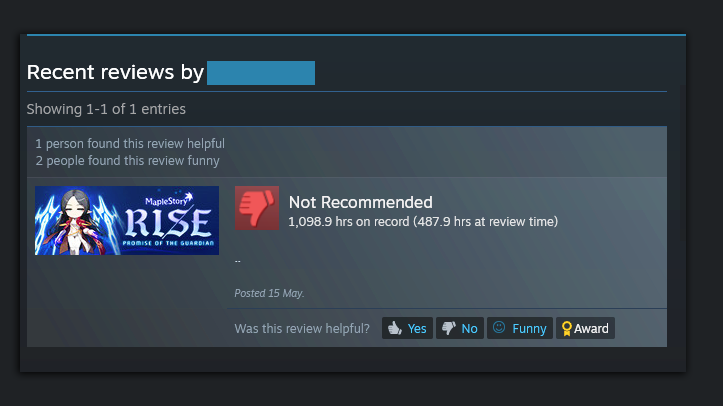 Mid or Meepo опубликовал скриншот отзыва на корейскую MMORPG MapleStory, который, по его словам, принадлежит Ане. Негативный отзыв без слов был оставлен 15 мая – тогда у Аны было 487 часов в игре. На момент публикации скриншота Ана наиграл еще 600 часов, но оставил отзыв негативным.