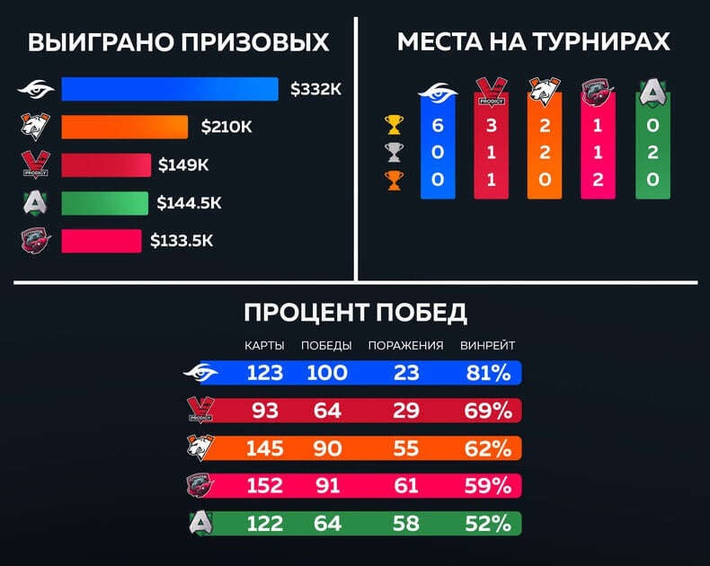 Составы Virtus.pro по Доте входят в топ-3 Европы и СНГ по сумме выигранных призовых, винрейту и местам на турнирах, согласно релизу пресс-службы ESforce.