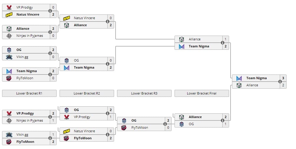 1 – Nigma2 – Alliance3 – OG4 – FlyToMoon5-6 – NAVI5-6 – VP.Prodigy7-8 – Ninjas in Pyjamas7-8 – Vikin.gg