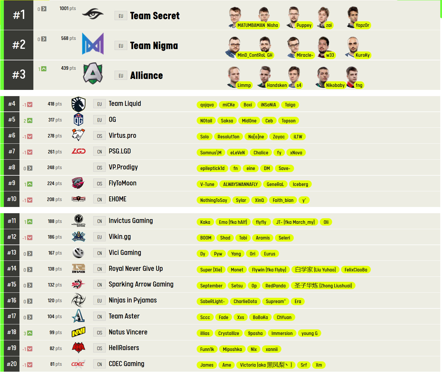 Secret сохранила первое место, а Nigma – второе. Alliance опередила Liquid и поднялась на третью строчку, а OG заняла 5-е место, обойдя Virtus.pro и PSG.LGD.