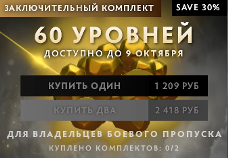 Один комплект содержит 60 уровней Боевого Пропуска и продается за 1 209 рублей (скидка 30%). На один аккаунт можно купить до двух «заключительных комплектов».