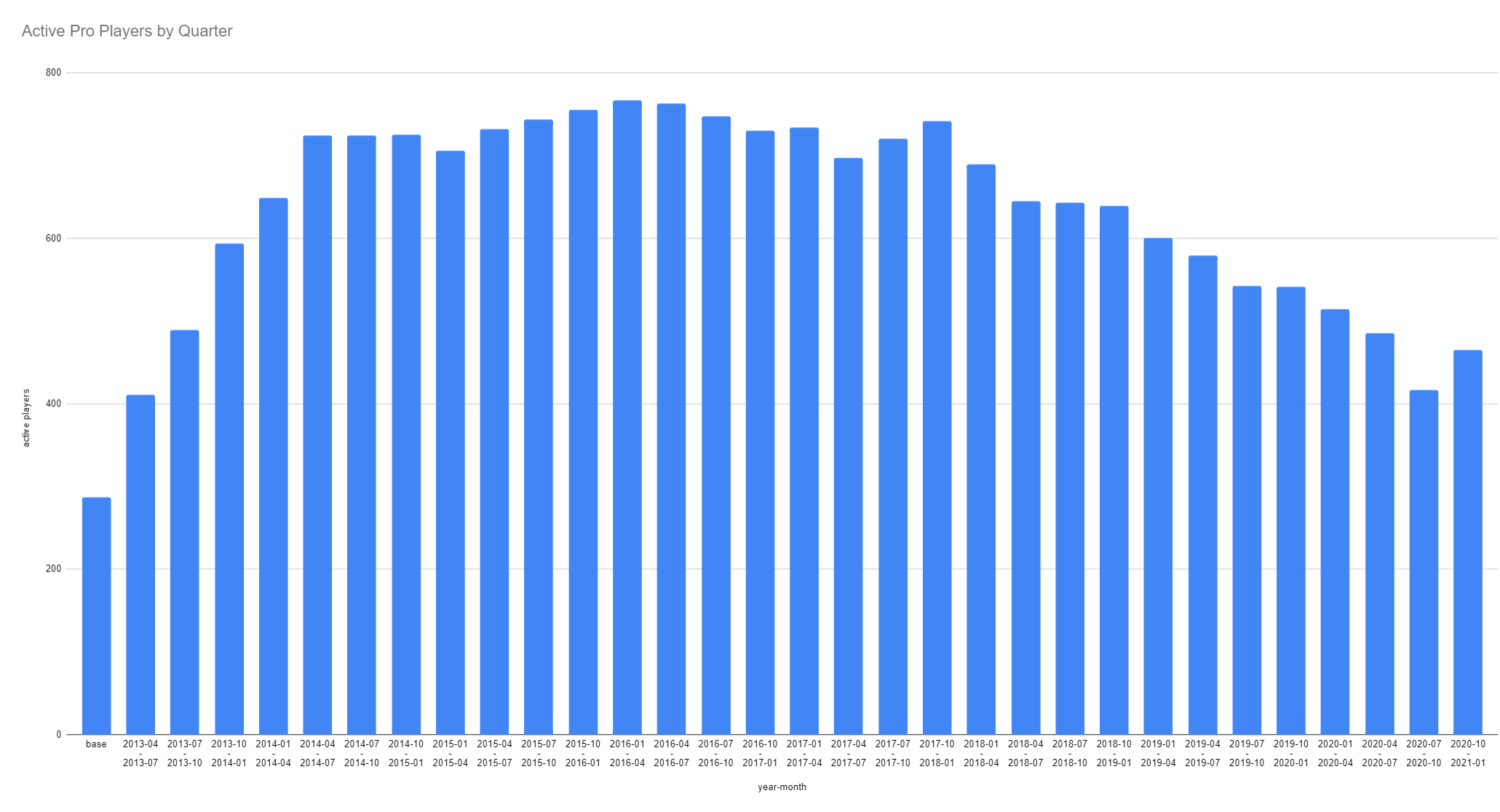 Также Noxville составил общий график активных игроков на про-сцене, начиная с июля 2013 года. Тенденция на втором графике полностью совпадает с первым: начиная с 2018 года количество про-игроков постепенно уменьшалось, а в третьем квартале 2020-го достигло показателя третьего квартала 2013-го – тогда про-сцена лишь начала формироваться.