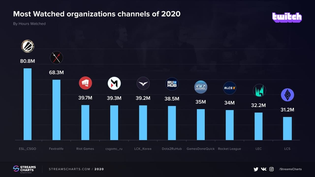 Сервис Streams Charts представил список самых популярных киберспортивных каналов на Twitch за 2020 год.