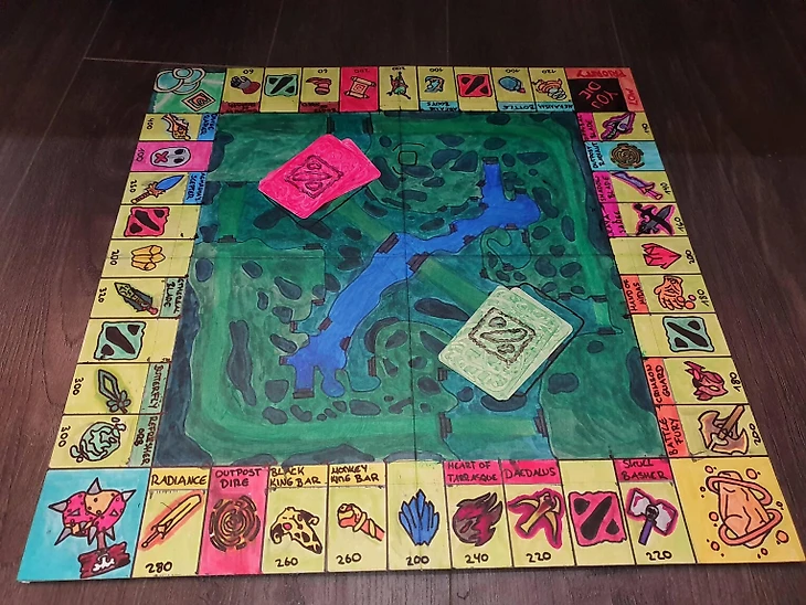 Игра создана фанатом Доты с нуля: пользователь сам нарисовал поле для игры, а также специальные карточки. Привычные дома и бизнесы геймер поменял на айтемы из Dota 2. Самым дорогим предметом на игровом поле, как и в оригинальной игре, стал Divine Rapier – в «Монополии» он обойдется в 400 монет.