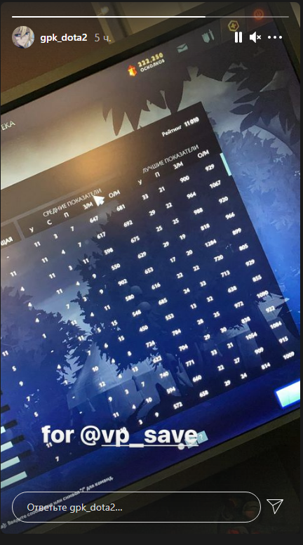 Игрок «медведей» поделился достижением в инстаграме: он выложил фото экрана и подписал его: «для Сэйва» – таким образом Скутин поддержал саппорта Virtus.pro Виталия «Save» Мельника, который был близок к 11К, однако из-за лузстрика не достиг этой отметки.