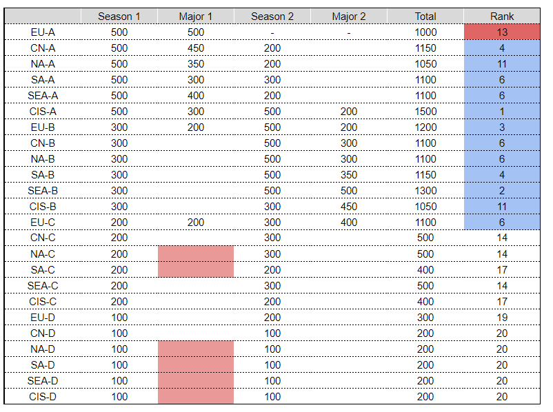 За победу в первом сезоне DPC и на мейджоре в сумме можно получить 1000 очков (500+500). Noxville приложил таблицу, на которой показал, в каком случае команда с тысячей очков может не получить прямой слот на TI.