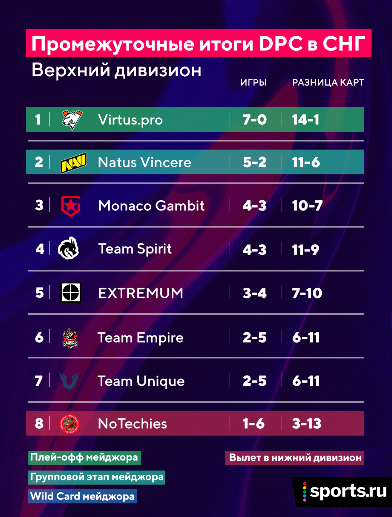 Virtus.pro выиграла все семь матчей в верхнем дивизионе, благодаря чему обеспечила себе место в плей-офф мейджора в Сингапуре. NAVI, проиграв VP 0:2 в решающем матче, получила слот в групповой этап турнира. Spirit и Monaco Gambit разыграют место в вайлд-карде мейджора, их встреча пройдет 1 марта.