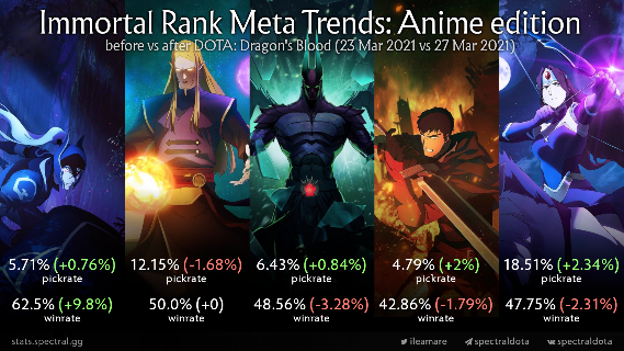 Аналитик Илья Силаков-Волынский опубликовал данные изменения винрейта и пикрейта главных героев аниме DOTA: Dragon’s Blood на ранге «Титан» в Dota 2. Статистика появилась в паблике Spectral Leamare во «ВКонтакте».
