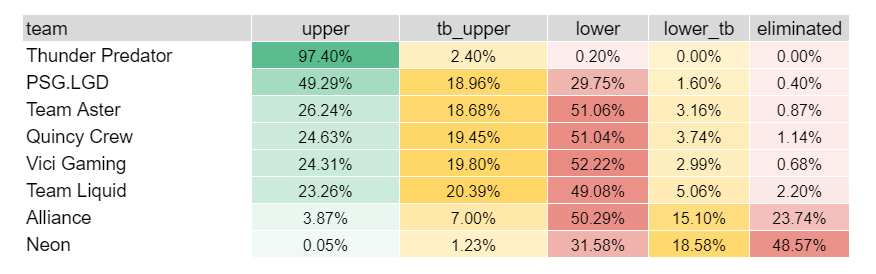 Текущий лидер турнирной таблицы Thunder Predator гарантировал себе место в следующем этапе турнире, при чем шанс перуанцев пройти в верхнюю сетку – 97,4%.