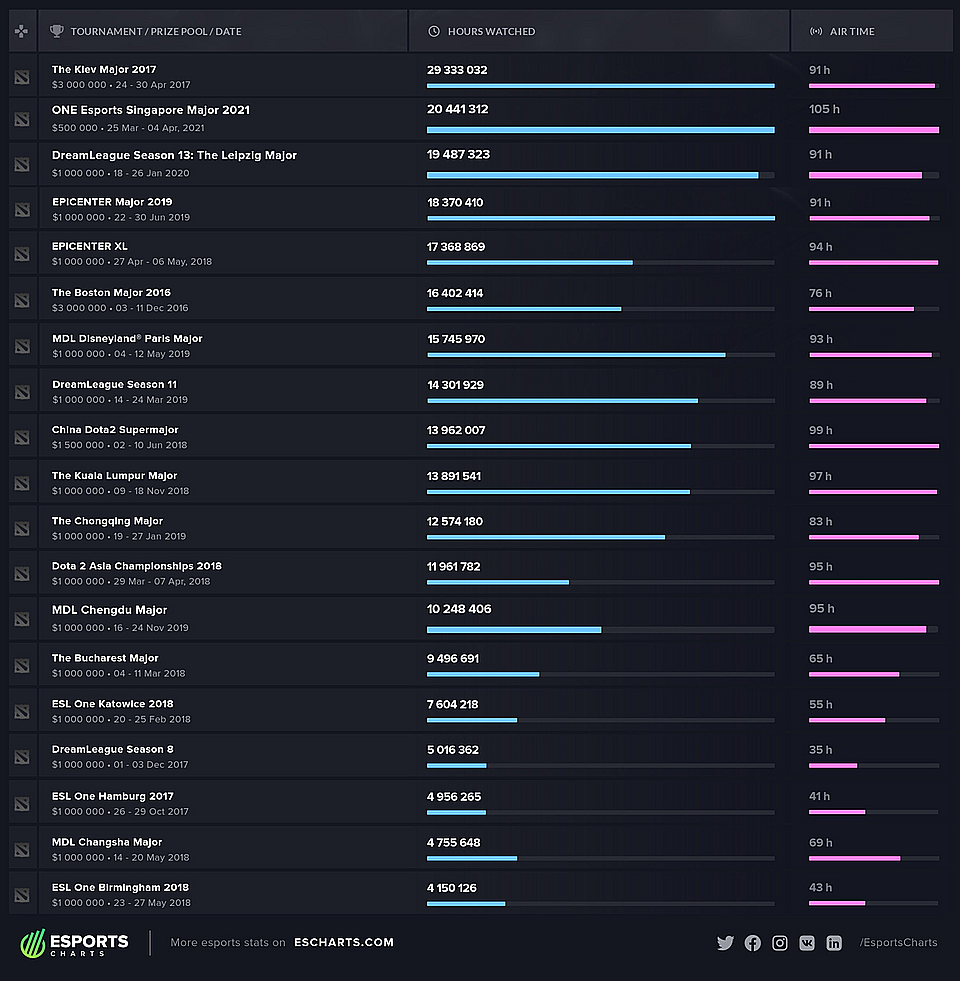 Лидером по общему времени просмотра остается Kiev Major 2017: тот мейджор в сумме смотрели более 30 млн часов. Пик трансляции мейджора в Киеве также существенно превышает показатель турнира в Сингапуре – более 800 тысяч зрителей одновременно.