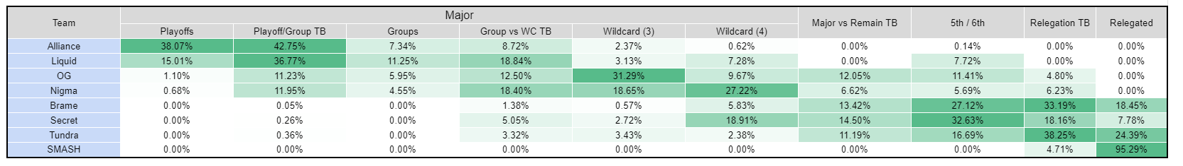 На втором месте с 15,01% шансом стать лидером таблицы и попасть в плей-офф мейджора находится Team Liquid. Теоретические шансы – 1,10% и 0,68% - на плей-офф мейджора остаются у OG и Нигмы соответственно.