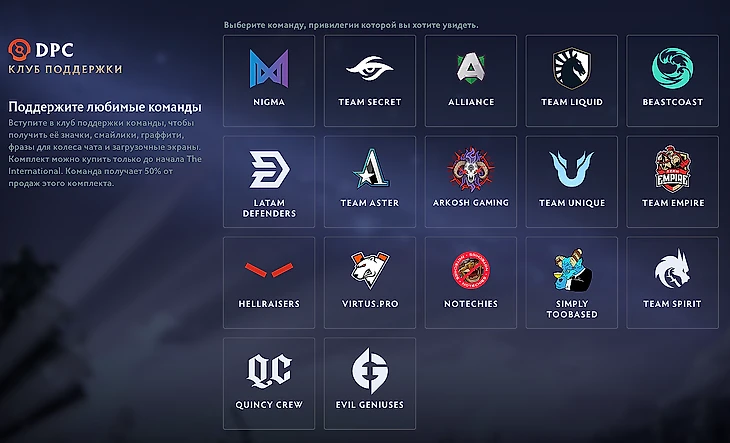На данный момент Valve добавила в игру 17 наборов поддержки. Среди них – Secret, Nigma, Alliance, Liquid, Evil Geniuses, и 6 бандлов команд из СНГ: Virtus.pro, NoTechies, Spirit, HellRaisers, Unique, Empire. Разработчики уточнили, что, по мере отправки и утверждения контента для бандлов от других клубов, их список будет регулярно обновляться.