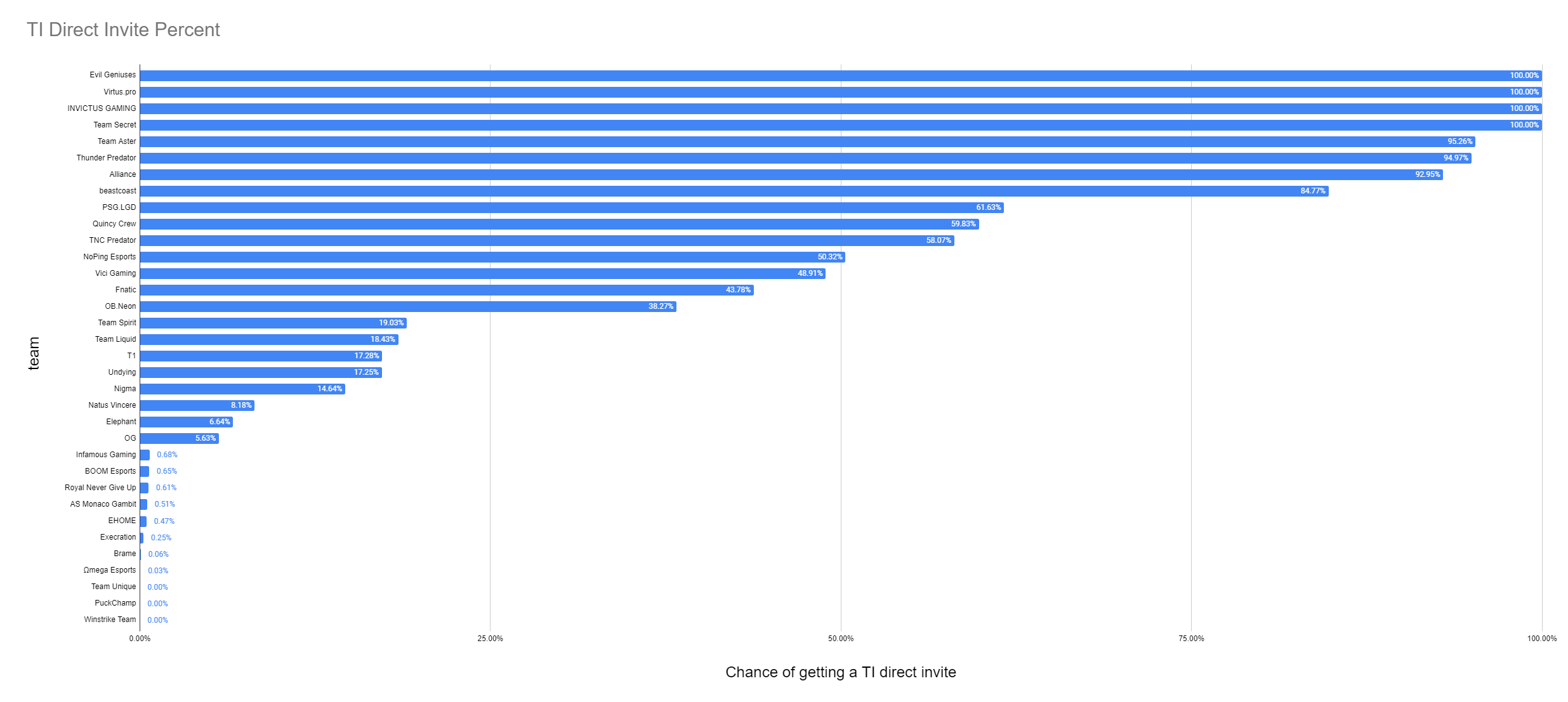 По результатам эксперимента Ноксвилля, вероятность того, что на TI напрямую попадет Virtus.pro, близится к 100%. Такой же результат показали Evil Geniuses, Secret и Invictus Gaming.