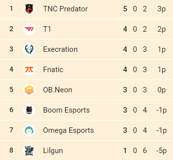 Fnatic (4-3), вне зависимости от результата матча между T1 (4-2) и Neon (3-3), примет участие в переигровке. Execration завершилась сезон с аналогичной статистикой – 4-3.