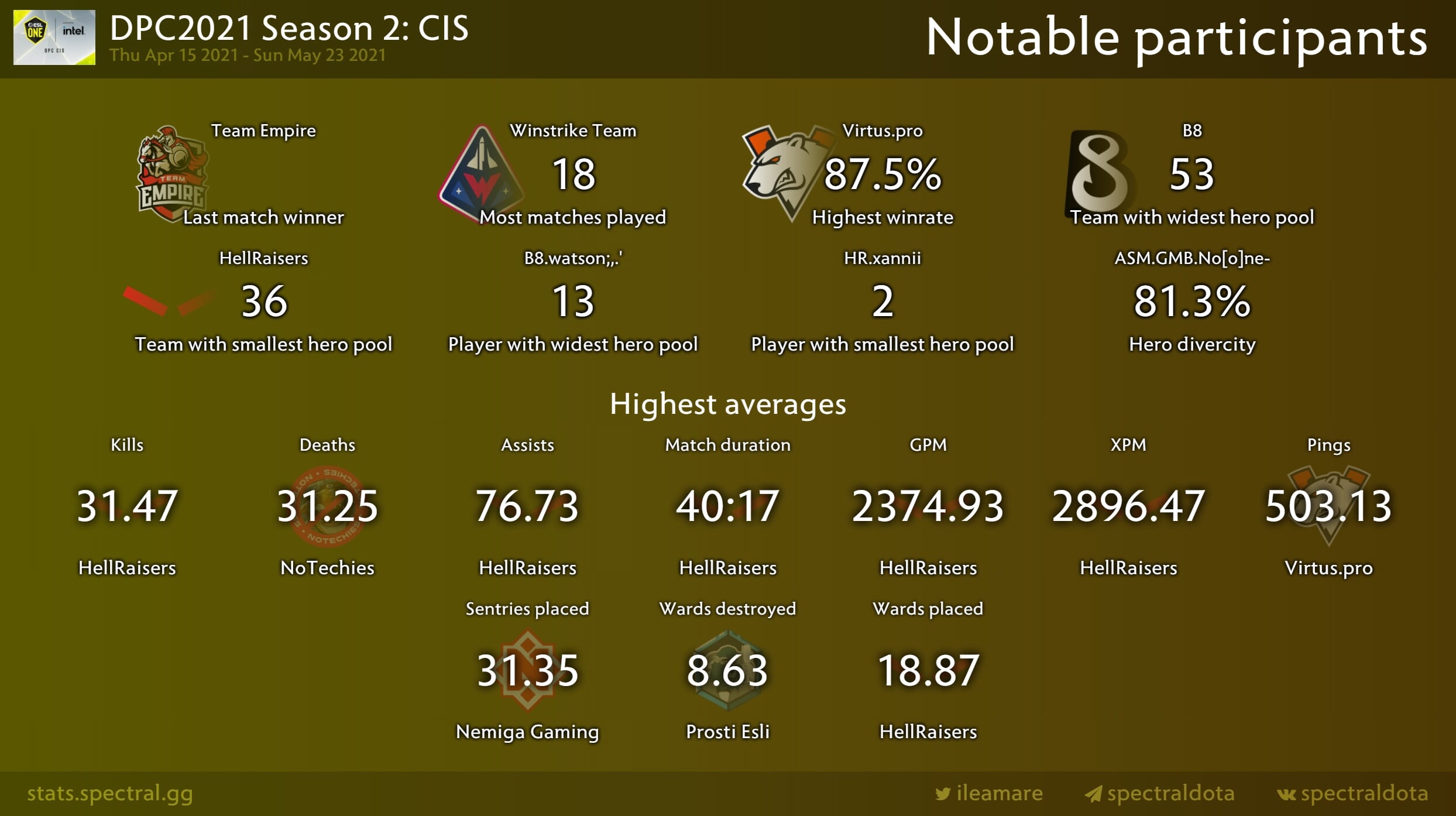 Самый маленький пул героев показали HellRaisers. Команда Романа «Resolut1on» Фоминка пикнула за время лиги 36 героев. Помимо этого, HR поставили рекорды по среднему количеству установленных вардов, убийств, опыта и золота в минуту, а также по длительности игр – в среднем, карты с участием клуба длились 40 минут.