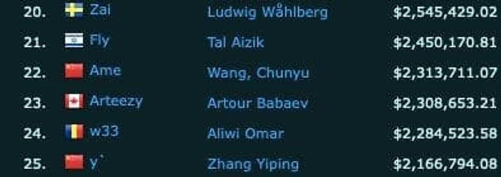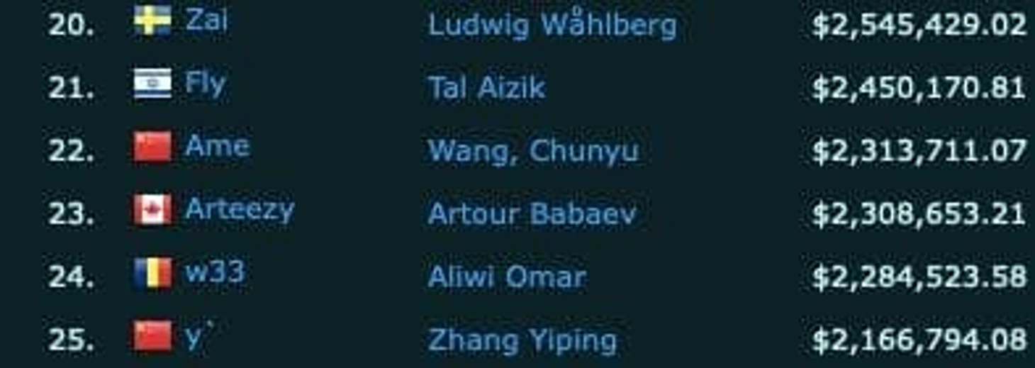 Лидером по заработанным призовым остается капитан OG Йохан «N0tail» Сундштайн – 6,97 млн долларов. В топ-30 только один игрок не в Dota 2 – фортнайтер Кайл «Bugha» Гирсдорф (3,17 млн, 12-е место).