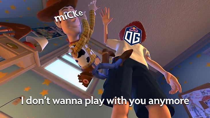 Team Secret потроллила OG после новости о возвращении Себа. Выложили мем, где Micke выбрасывают, как ковбоя Вуди