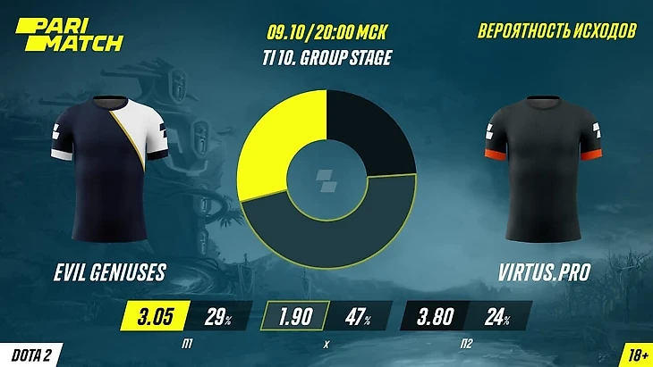 9 октября в Бухаресте состоится очередной матч групповой стадии The International 10 по Dota 2, в котором Virtus.pro сыграет против Evil Geniuses. В букмекерской компании Parimatch рассказали о ставках своих клиентов на предстоящую битву.