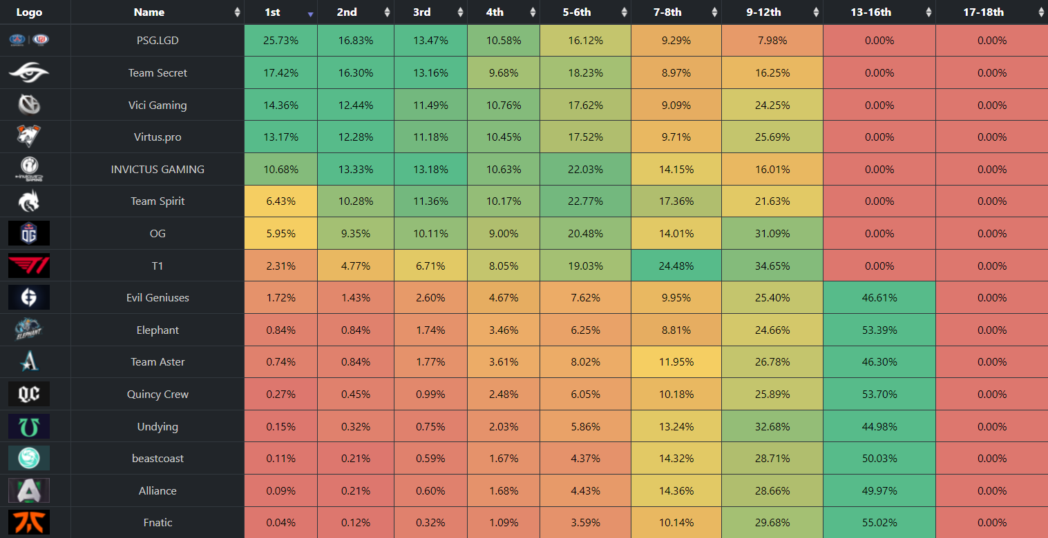 По расчетам Ноксвилля самые большие шансы на победу у PSG.LGD – 25,73%. На втором месте Team Secret – 17,42%. Третье место у Vici Gaming – 14,36%.