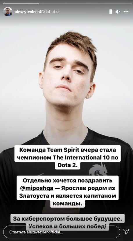 «Команда Team Spirit вчера стала чемпионом The International 10 по Dota 2. Отдельно хочется поздравить Мипошку – Ярослав родом из Златоуста и является капитаном команды.