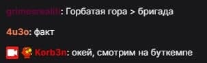 Один из зрителей стрима Корбена оставил сообщение в чате «Горбатая гора» > «Бригада». Менеджер тут же отреагировал: «Окей, смотрим на буткемпе». На самой трансляции Белов смотрел фильм «Святые из Бундока».