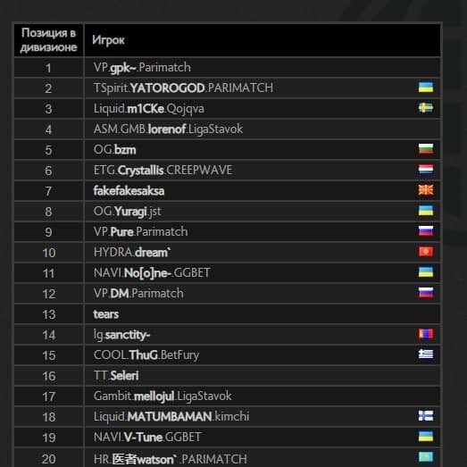 В первую десятку также входят Артем «Lorenof» Мельник, Артем «Yuragi» Голубев, Иван «Pure» Москаленко и Кыялбек «Dream» Тайиров.
