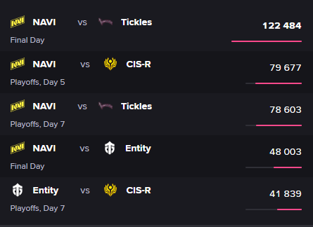 За решающей встречей турнира на пике следили 122 тысячи человек. На втором месте расположился матч NAVI – CIS Rejects – 79 тыс. Тройку лидеров замкнула встреча между NAVI и Tickles в финале верхней сетки – 78 тыс.
