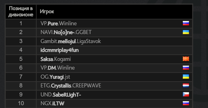 Мидер NAVI Владимир «No[o]ne» Миненко занял второе место в рейтинге, а прошлый лидер топа мидер Gambit Esports Максим «mellojul» Пнев – на третьем. В топ-10 также оказались Дмитрий «DM» Дорохин (6-е место), Артем «Yuragi» Голубев (7-е) и Игорь «ILTW» Филатов (10-е).