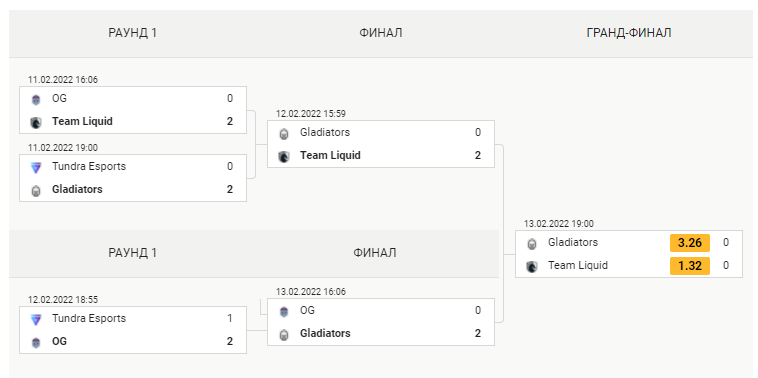 16:00 OG 0:2 Gladiators19:00 Liquid 1:3 Gladiators