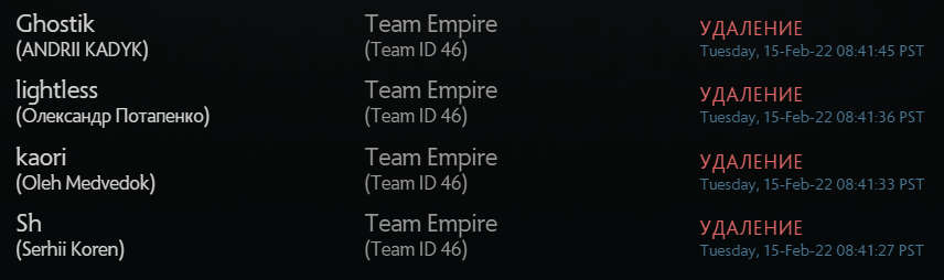 Капитан команды Андрей «Ghostik» Кадык, а также Сергей «Shisui» Корень, Олег «Kaori» Медведок и Александр «Lightless» Потапенко были удалены из Team Empire на сайте регистрации команд.