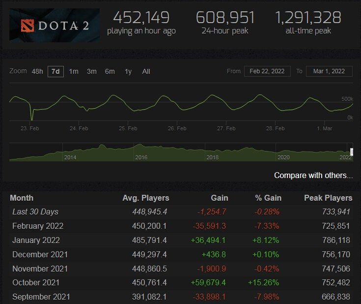 Средний онлайн Dota 2 в феврале 2022 года составил 450 тысяч игроков.