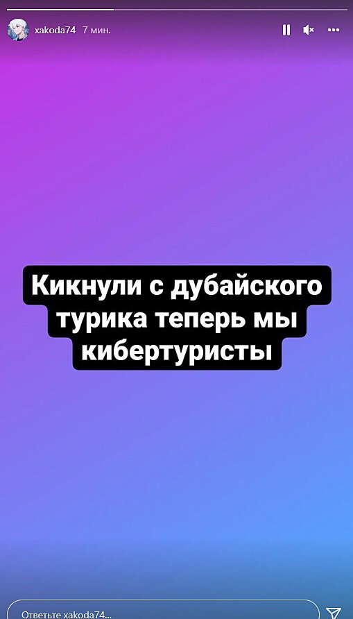 «Кикнули с дубайского турика, теперь мы кибертуристы», – сообщил Егор «Xakoda» Липартия в сторис. Спустя время запись была удалена.