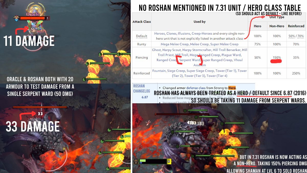 TeaGuvnor написал, что Valve не указала в новом патче класс у Рошана – теперь он не является героем. Из-за этого проникающий урон от змеиных тотемов Шэдоу Шамана по Рошану увеличился до 150% (урон по героям от змеиных тотемов составляет 50%).
