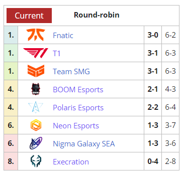 В таблице первого дивизиона лидируют с тремя победами лидируют Fnatic, T1 и SMG. При этом Fnatic выиграла три матча из трех, когда как T1 проиграла Polaris, а SMG уступила T1.