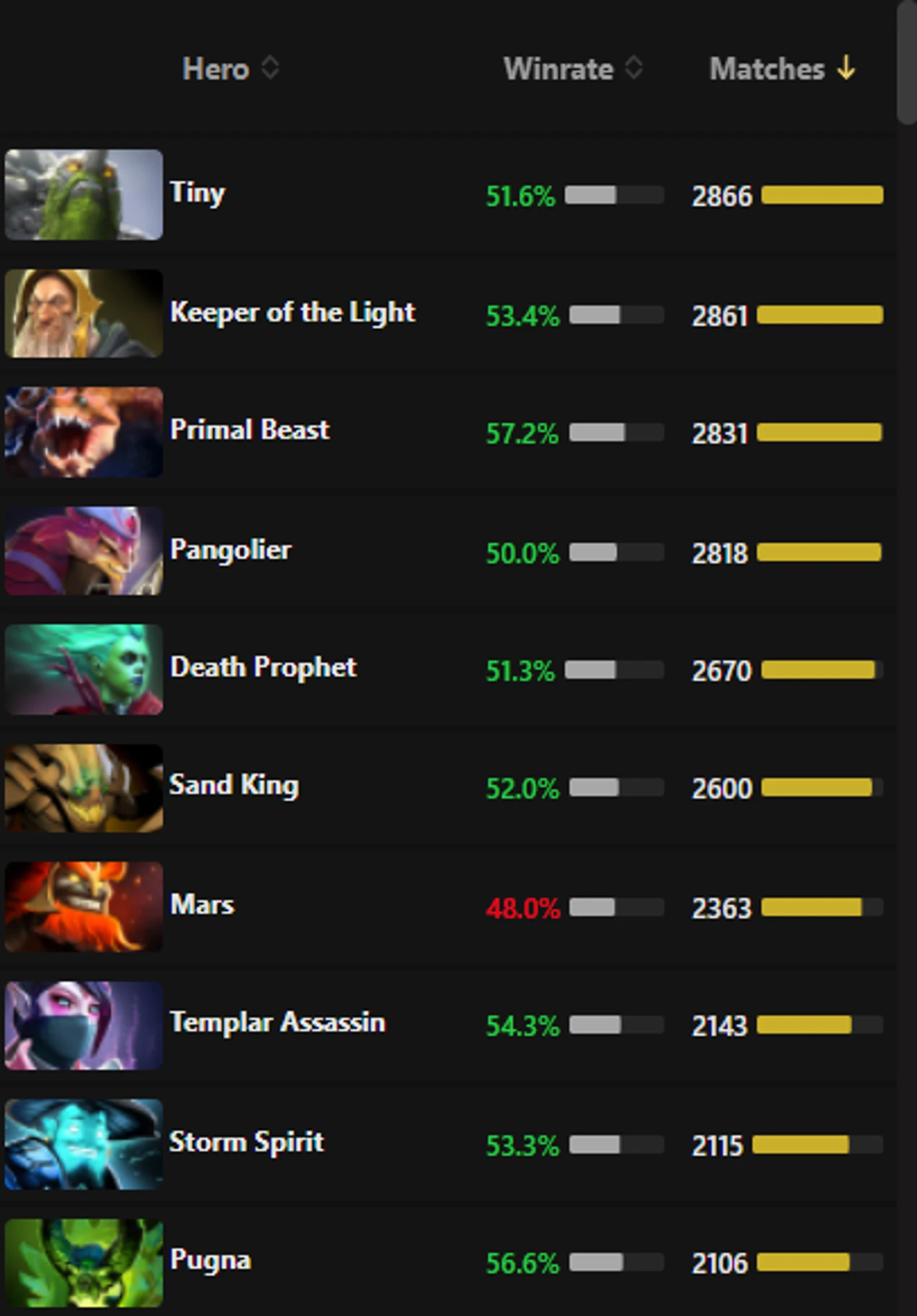 Далее идут Keeper of the Light (2861) с винрейтом 53,4% и Primal Beast (2831) с винрейтом 57,2% (третье место по винрейту).