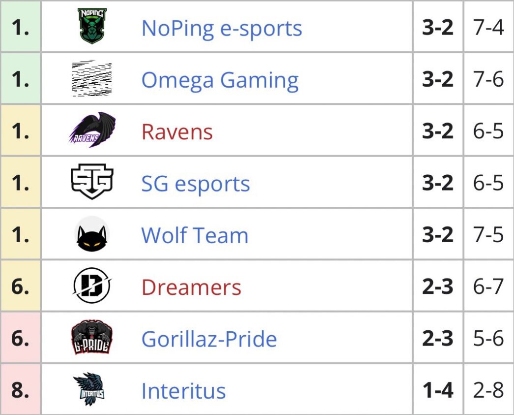 У NoPing e-sports, Omega, Ravens, SG esports и Wolf Team 3 победы и 2 поражения в лиге. До конца сезона всем осталось сыграть по 2 матча.