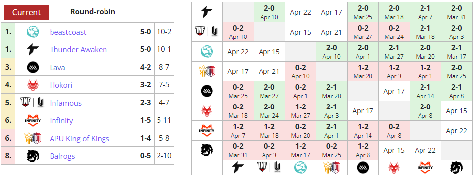 Beastcoast идет на первом месте со счетом 5-1, Infamous – на пятом с 3:3.