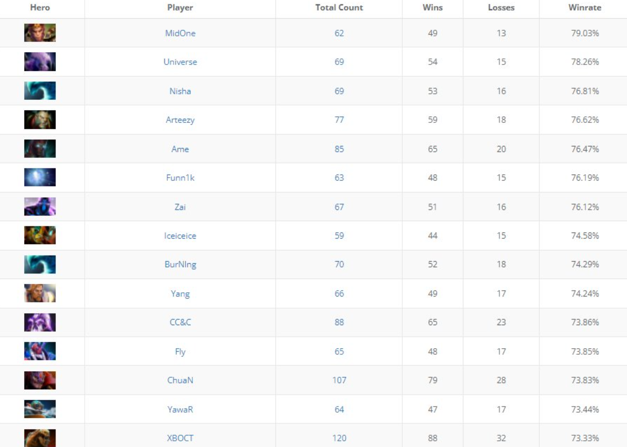 Йек «MidOne» Най Чжэн показал самый высокий винрейт на одном герое – у него 79% победных матчей на Monkey King.
