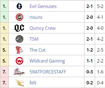 В верхнем дивизионе Evil Geniuses с 2 победами делят первую строчку турнирной таблицы с TSM, Quincy Crew и Nouns – однако у последних двух команд еще есть игра в запасе.