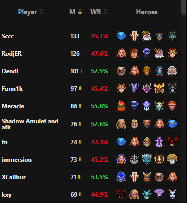 Dendi вошел в топ-3 по играм в матчмейкинге за неделю. Больше всего он играл на мидовом Пудже