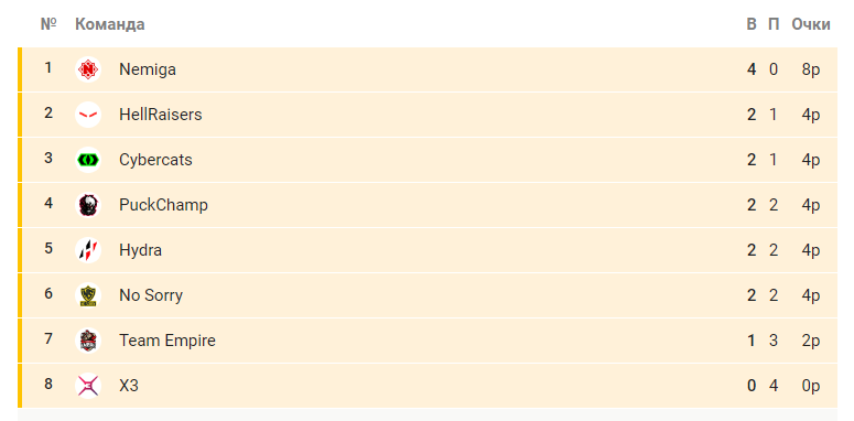 На счету пяти клубов по 2 победы: Cybercats, Hydra, X3, No Sorry, PuckChamp. Empire с результатом 1-3 занимает 7-е место, X3 – восьмое (0-4).