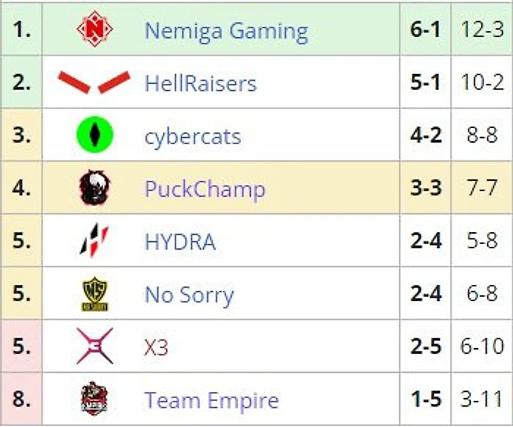 Вылететь рискуют Empire (1-5), X3 (2-5), Hydra (2-4) и No Sorry (2-4).