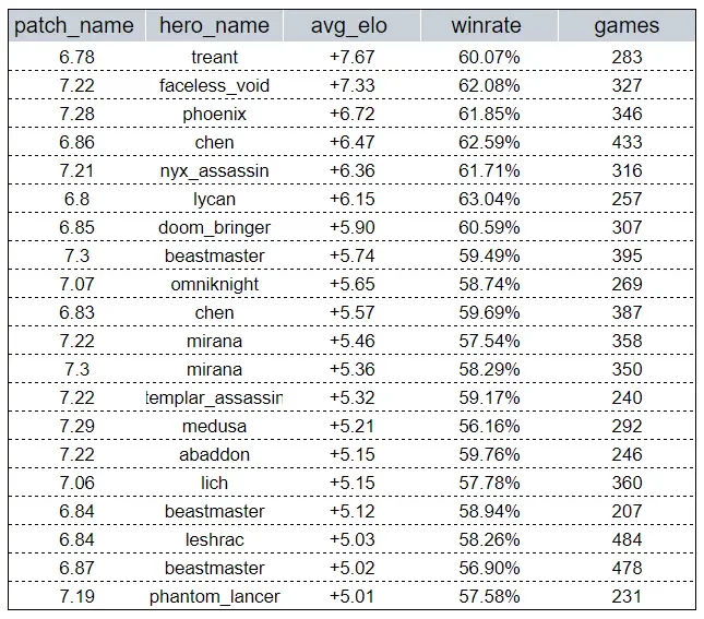 Сила героев оценивается не просто по винрейту, а с учетом рейтинга Эло – то есть с поправкой на уровень игры команд.