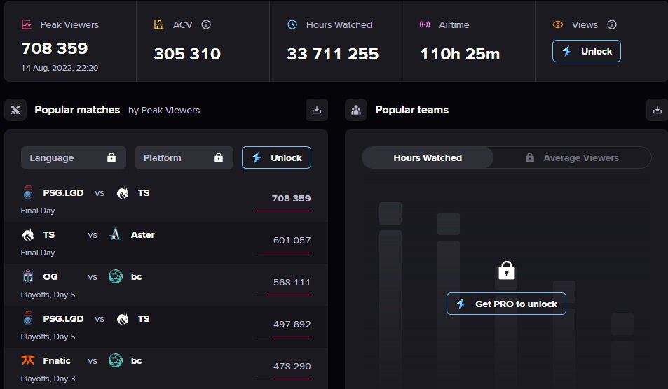 В пике за турниром наблюдали 708 тысяч зрителей, самым популярным матчем стал гранд-финал между PSG.LGD и Spirit – это 2-й результат среди всех мейджоров после киевского, который собрал 842 тысячи зрителей на финале.