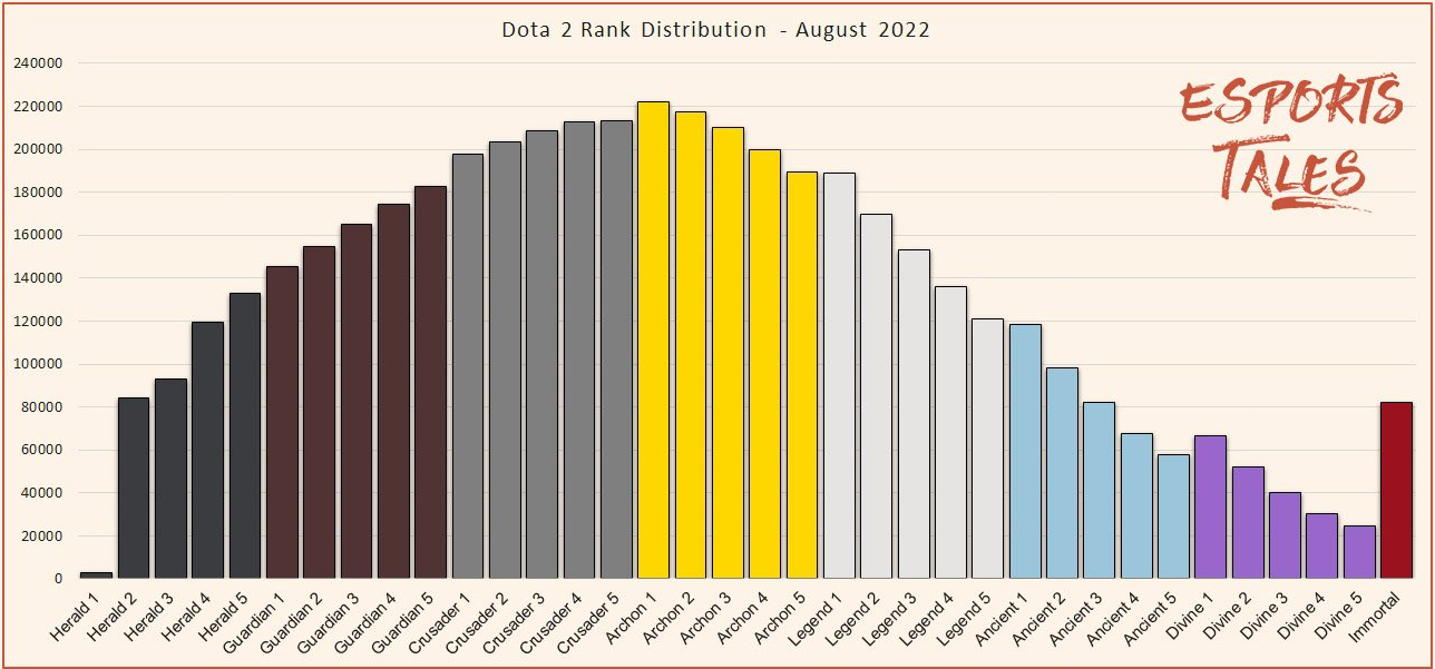 Только 13% игроков в Доту имеют ранг выше «Властелина 1», у 0,06% ранг «Рекрут 1», самый частый – «Герой 1».