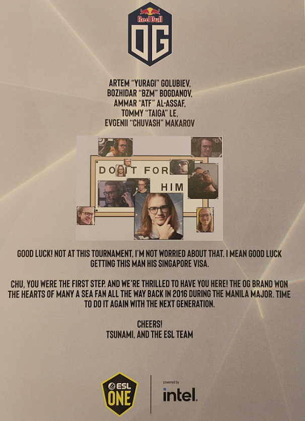 OG получили приветственное письмо с коллажем «Сделайте это ради него» про Мишу от организаторов ESL One Malaysia