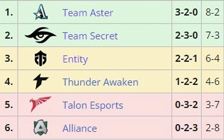 По их результатам Aster и Secret прошли в верхнюю сетку плей-офф, а Entity и Thunder Awaken сыграет в нижней сетке. Турнир покинули Alliance и Talon.